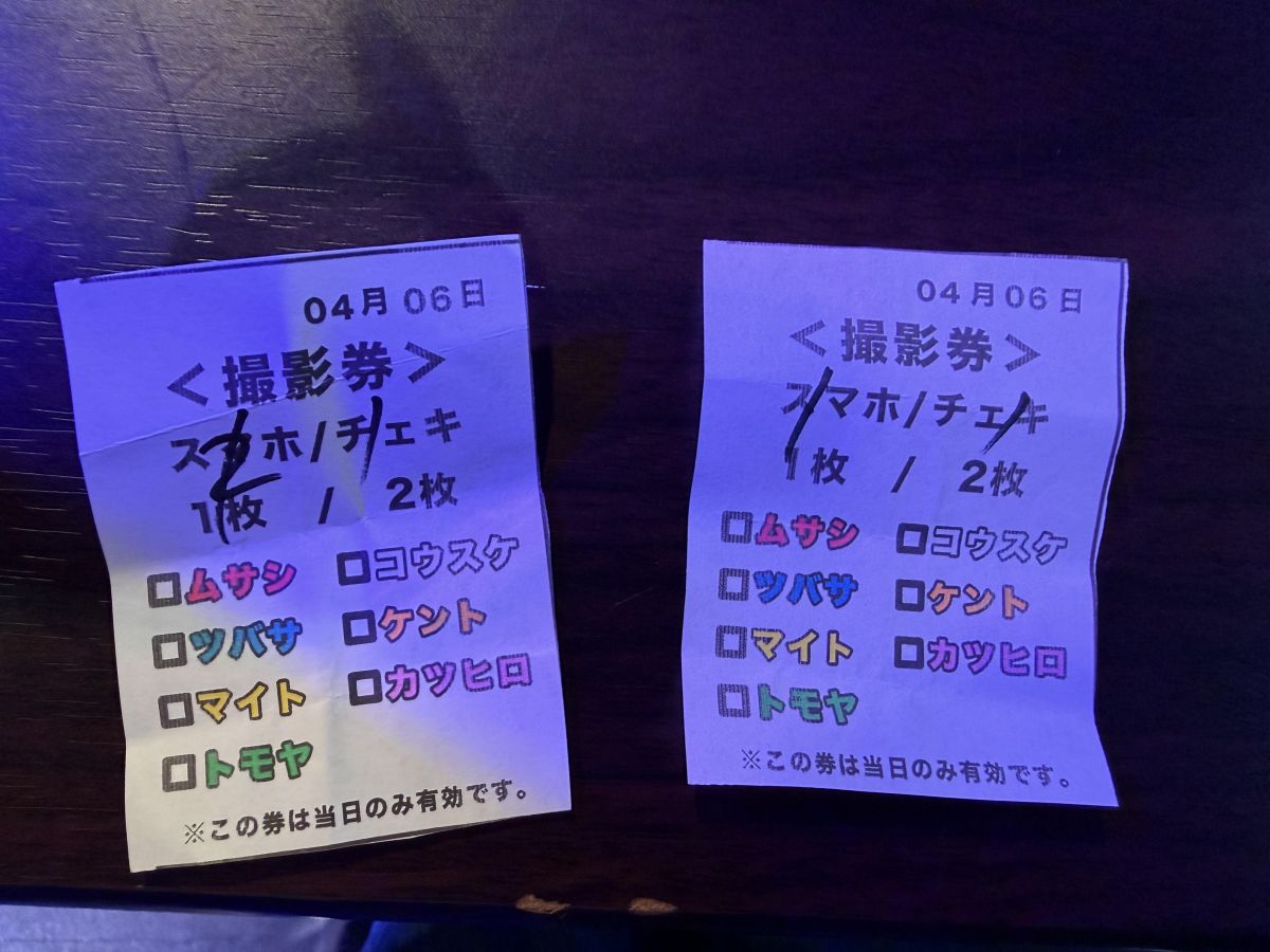 チェキ券へのスタッフの記載方法は添付画像のような形になります(種類の上に枚数を記載)ので、撮影の際撮影券をスタッフにお渡しください。